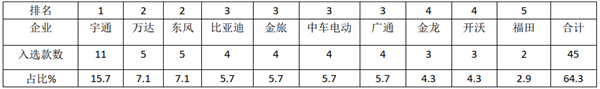 宇通客车上榜11款车型,位居榜首;万达客车、东风客车均以5款上榜并列第二; 比亚迪、中车电动、金旅及广通客车均以4款上榜并列第三; TOP10累计占比超6成