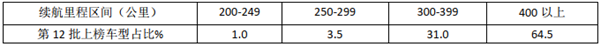 在2020年第12批目录中,续航里程占比呈现的特征是:
