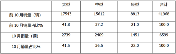 从上表可见,无论是2020年1-10月还是10月,大型客车占比均在4成以上,居于最大,中型客车占比次之,轻型客车占比最小。
