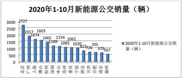 2020年1-10月新能源公交客车在区域市场流向极不平衡,前15名城市占比超4成(43.82%),其中北京、广州、上海位居前三甲,全国还有绝大部分城市需求很少或者几乎是零销售。