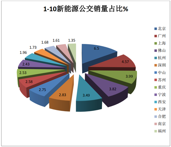 根据各地上牌信息统计,2020年1-10月前15名城市新能源公交销量占比: