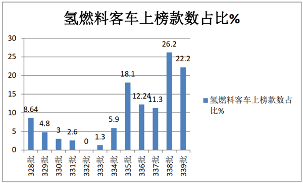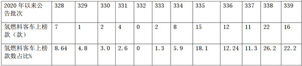 根据统计,2020以来,截止目前工信部共计发布了11批(从328批到339批)客车新品公告,每个批次公告中,燃料电池上榜款数及占比如下: