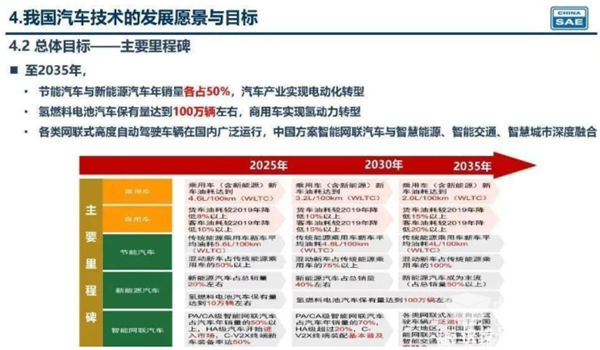 另外,近日由汽车工程 学会牵头编制的《节能与新能源汽车技术路线图2.0》正式发布,技术路线图2.0分别以2025年、2030年、2035年为关键节点,设立产业总体发展里程碑,预计到2035年,节能汽车与新能源汽车年销售量占比达50%;燃料电池汽车保有量将达到100万辆;在商用车板块,未来商用车将实现氢动力转型(见下截图)。