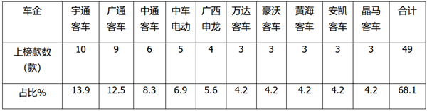 特点四、上榜企业中,宇通客车上榜新能源客车10款,数量位居第一,广通客车上榜9款,位居第二;中通客车上榜6款,位居第三,中车电动上榜5款位居第四, 广西申龙上榜4款,占比5.6%,位居第五;TOP10企业累计占比近7成