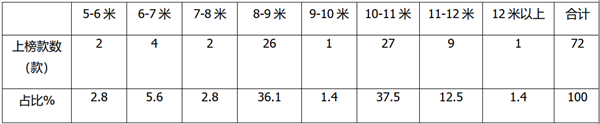 可见,在本批次新能源客车上榜的新品中,按长度段划分上榜车型中,10-11米段上榜27款,占比37.5%,居第一;其次是8-9米上榜26款,占比36.1%;再次是11-12米,上榜9款,占比12.5%。第四是6-7米上榜4款,占比5.6%;第五是5-6米,上榜2款,占比2.8%;最少的是一款18米段的重汽豪沃牌特大型纯电动城市客车ZZ6186GBEVQ2,占比1.4%(见下截图)。