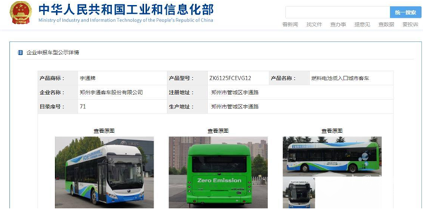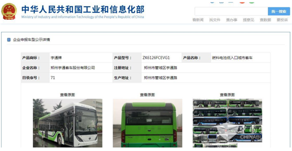 在本批次上榜的16款燃料电池客车新品中,10-11米段上榜8款,占比半壁江山,为最高;其次是11-12米段,上榜5款,占比为31.3%,第三;再次是8-9米,上榜3款,占比18.8%,其他长度段均没有车型上榜。因此,这一特点分析,再次说明,下一步燃料电池客车示范推广受热捧的车型可能还是10-11米段。其中宇通客车上榜3款燃料电池客车,为最多(1款燃料电池城市客车,2款燃料电池低入口城市客车,见下截图)。