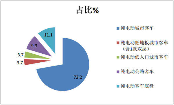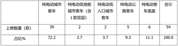 特点七、上榜的54款纯电动客车中,按类别划分,纯电动城市客车上榜35款。占比61.4%,为最大;其次是纯电动公路客车9款,占比15.8%,再次是纯电动客车底盘7款,占比12.3%;低入口城市客车上榜6款,占比11.6%