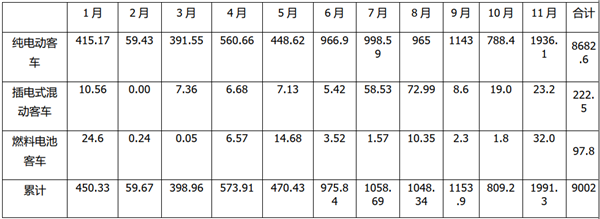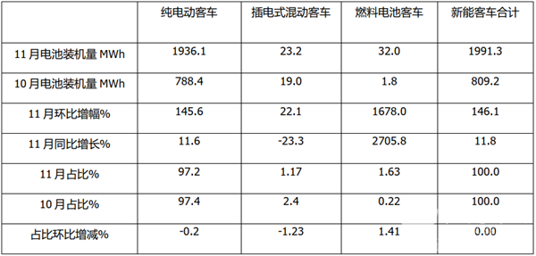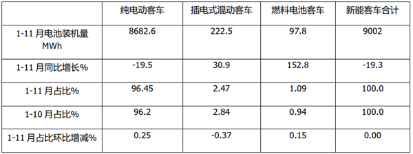 纯电动客车动力电池装机量累计8682.6MWh,在1-11月中各月中,11月处于最高;插电式混合动力客车动力电池装机量累计222.5MWh,在1-11月中8月处于最高;燃料电池客车动力电池装机量累计97.8MWh,在1-11月中11月处最高;11月新能源客车总装机量在前11月中处于最高,其次是7月,再次是9月。