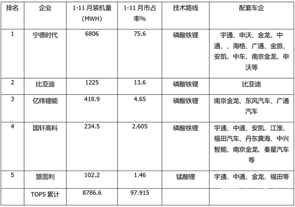 在2020年1-11月新能源客车动力电池配套企业中,宁德时代霸主地位明显,配套的装机量占比75.6%,其次是比亚迪,占比13.6%,再次是亿纬锂能,占比4.65%,TOP5累计占比97.9%,垄断程度比1-10月进一步提高,几乎垄断了新能源客车行业。