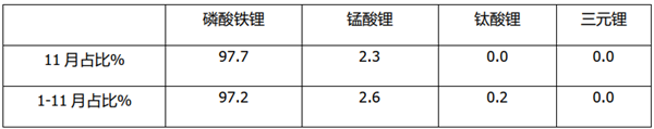 上表可见,不管是11月还是1-11月,在新能源客车动力电池装机量中,磷酸铁锂电池占比均是一家独大,占据绝对主体地位,主要是磷酸铁锂电池的良好的热稳定性和安全性能,更适合载人的客车所致。