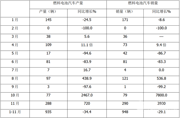 根据中汽协数据,2020年1-11月燃料电池汽车产销统计: