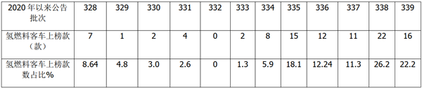 特点四、2020年工信部历次发布的燃料电池汽车公告中,燃料电池客车上榜款数及占比总体呈现升高趋势