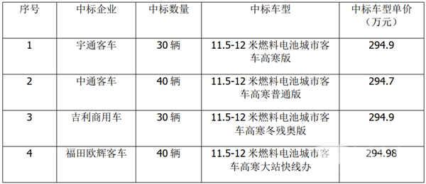 订单数量:140辆,由宇通、中通、吉利商用车、北汽福田四家中标。