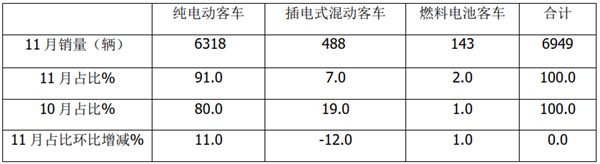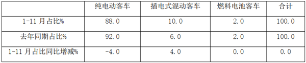 上表可见,在2020年1-11月新能源客车销量结构中,纯电动占比88%,同比下降4个百分点;插电式混合动力客车占比6.0%,同比占比增减4个百分点;燃料电池客车占比2%,同比基本持平。