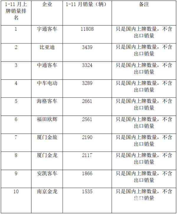 根据上牌信息,2020年1-11月TOP10客车企业新能源客车上牌销量排行: