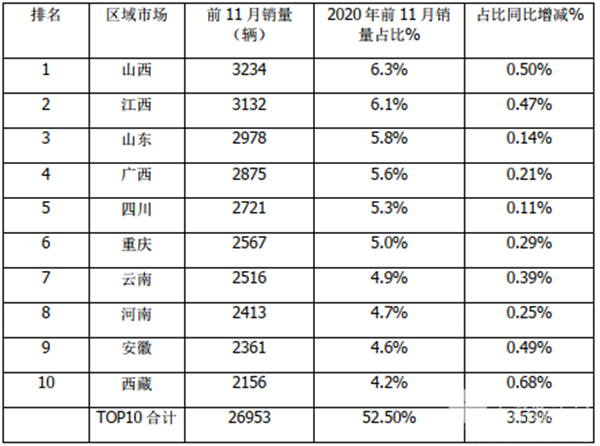 三、2020年前11月,农村客车销量区域流向不均,TOP10 中山西占比最大,西藏占比同比增加最多