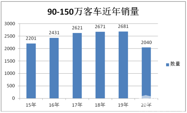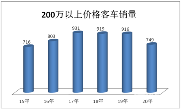 从上图表看出,价格在200万以上的高档客车细分市场,近6年的增长规律不太一样:前3年同比上升,后3年下降;2017年升幅最大,但到了2018年出现拐点,2019年延续了2018年的规律,2020年同比还是下降,且同比降幅最大(-50.9%)。