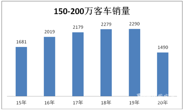 2) 2015年到2019年,对价格在150-200万的销售情况分析:此区间的销量从2015年到2019年,销量呈现上升,2016年上升幅度最大,只有2020年是销量唯一下降(-34.9%)的年份,具体见下表、下图