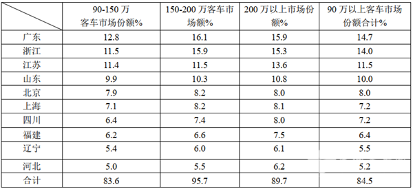在90-150万的价格区间,集中度为83.6%,说明在该细分市场重点区域的垄断程度不是很高,留给其他区域的机会相对较大,其他区域的机会不到17%;150-200万的价格区间的集中度为95.7%,留给其他区域的机会只有4.3%;200万以上的集中最高度为89.7%,留给其他区域的机会只有10.3%。也就是说,90万以上高档客车在150-200万以上区间集中度最高,90-150万集中度最低,200万以上区间次高; 3、2020年广东是高端客车市场需求量最大的区域市场,其次是浙江,再次是江苏,均是经济较发达的区域市场。说明高档客车市场大小与经济发达程度密切关联。