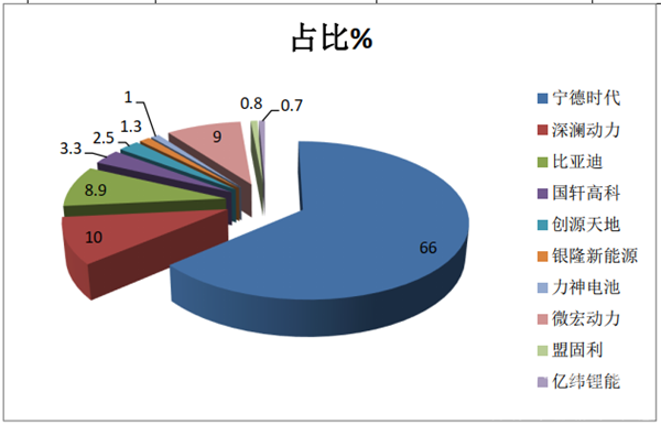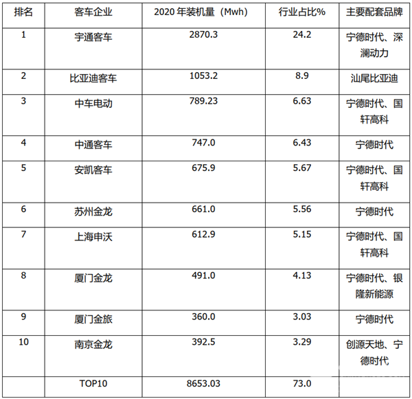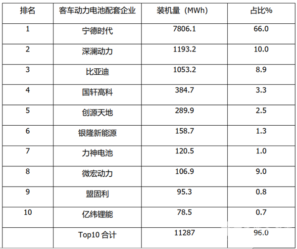 在2020年新能源客车动力电池配套企业中,宁德时代一家独大,配套的电池装机量7806.1(MWh),占比66%,其次深澜动力,电动装机量为1193.2(MWh),占比10%;第三是比亚迪,电池装机量为1053.2(MWh),占比8.9%;top10累计装机量为11287(MWh),占比为96%,几乎垄断了整个行业。