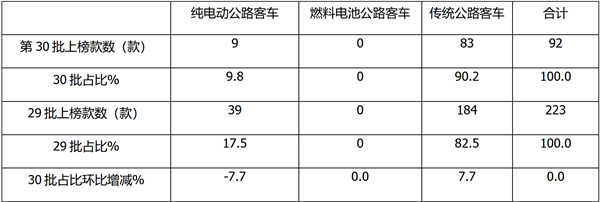 表1(数据来源:交通部30批达标车型公告)