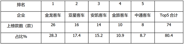 根据统计,本批次上榜的达标客车车型共由14个车企提供,TOP5企业上榜车型数量及占比: