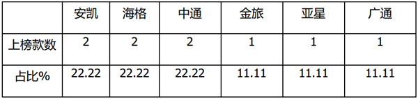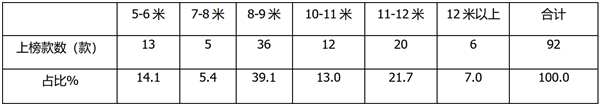 第二是11-12米车型,上榜20款,占比21.7%,说明公路客车市场中。