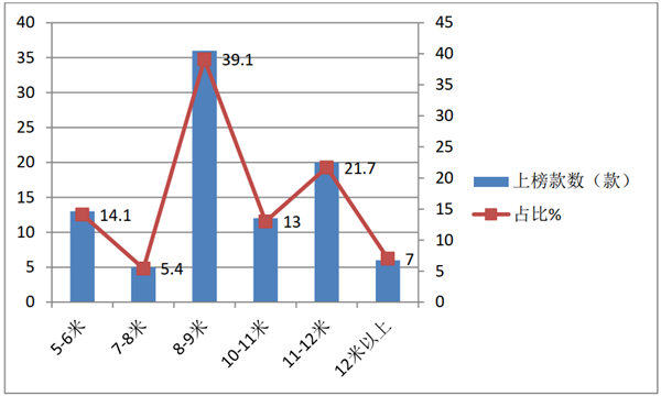 特点三:本批次上榜车型按长度段划分,8-9米入36款,占比39.1%,位居第一,是最受恩宠的车型;11-12米车型上榜20款,占比21.7%,位居第二;5-6米入选13款,占比14.1%,位居第三