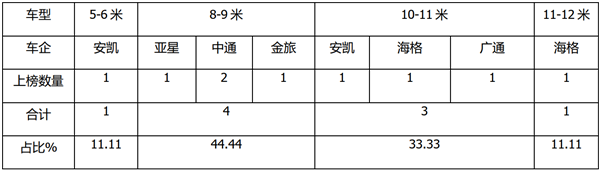 另外从上表也可以看出,本批次纯电动公路上榜最多车型的是安凯、海格和中通客车,上榜均2款,占比均为22.22%,并列第一;其余车企均为1款,占比均为11.11%。
