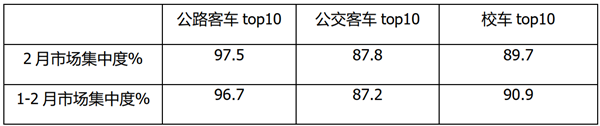 四、从2021年2月及1-2月TOP10车企市场集中度看,公路客车市场集中均为最高