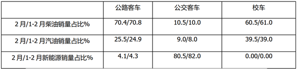 根据上牌数据,2021年2月及1-2月5米以上公路客车、公交客车及校车三大细分市场中柴油、汽油及新能源占比情况统计: