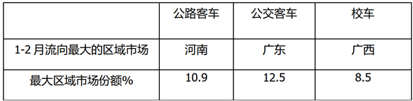 上图表可见,从区域流向看,2021年1-2月5米以上客车市场三大细分市场中: