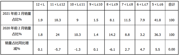 在2021年前2月5米以上公路客车按车型长度段划分其市场结构特征: