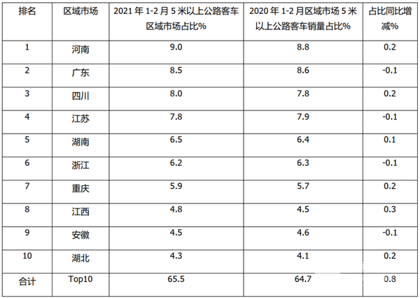 特点五、区域流向不均,2021年前2月公路客车区域市场流向中,河南居榜首,湖南居第二,四川占第三;top10累计占比65.5%,同比增加08%