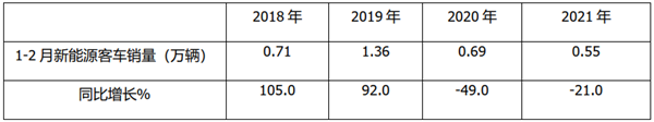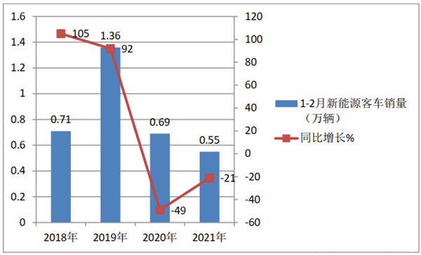 上图表可见,2021年1-2月新能源客车上牌销量在近4年同期中处于最低,同比增长-21%,在近年同期中居于第三。
