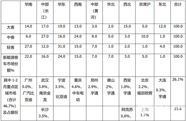 根据中国汽车流通协会数据,2021年1-2月大中轻新能源客车流向全国9大地区及其中的重点区域市场份额情况统计: