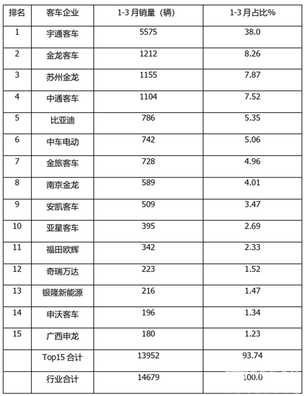 “二通二龙+比亚迪”居前五 一季度7米以上大中型客车销量榜单出炉