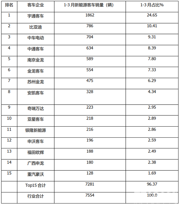 上图表可见,在2021年1-3月7米以上大中型新能源客车销量及占比中,TOP15客车企业呈现以下特点: