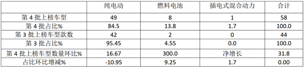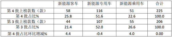上表可见,在2021年第4批新能源汽车推荐目录入选车型中,新能源客车上榜58款车型,占比25.8%,比占比最多的新能源专用车少近25.8个百分点,比占比第二的新能源乘用车占比多近3.2个百分点,居于第二,占比环比增加4.4个百分点,是占比增加最大的细分车型。