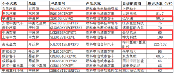 燃料电池客车上榜为8款车型,上榜数量环比暴涨300%,占比为13.8%,且占比环比增加近9.25个百分点,是环比占比增加最大的细分车型,也是本批次目录中最大的一个特点。这8款燃料电池客车是(见下截图):