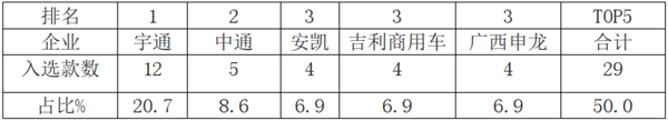 特点二:宇通客车上榜最多。本批次中有21家客车上榜,上榜车型最多的是宇通客车入选12款车型;其次是中通客车上榜5款,再次是吉利商用车、安凯客车和广西申龙,均上榜4款车型;top5累计上榜29款,占比半壁江山
