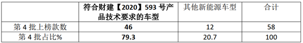 上表可见,在2021年第4批新能源客车推荐目录中,符合财建符合财建【2020】593号产品技术要求的车型占79.3%,为此次新能源客车推荐目录上榜车型中的主体;其他占比20.7%,处于次要地位。