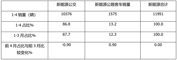 上表可见,在2021年1-4月新能源客车销量中,新能源公交占比86.8%,占据绝对优势,但比前3月收窄了0.9个百分点;新能源公路客车占比只有13.2%,处于从属地位,但比前3月扩大了0.9个百分点。说明前4月与前3月比,新能源公交地位也被削弱,新能源公路客车市场地位加强。
