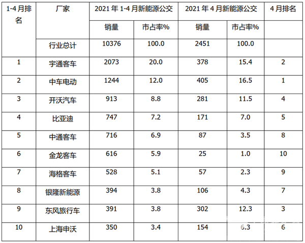 从上表看出,2021年4月及1-4月,在新能源公交客车主流企业销量TOP10中特点分别如下: