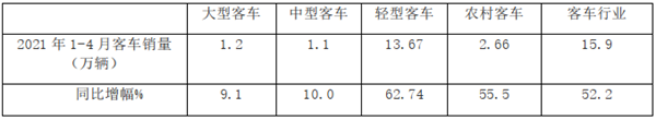 上表显示,2021年1-4月农村客车销量同比增幅55.5%,比前4月大中型客车市场的增幅都高很多(高出大中客车市场的增幅分别为46.4%和45.5%),比前4月客车行业的平均增幅52.2%的增幅也高出近3.3个百分点,跑赢客车大盘,是促进今年1-4月客车市场增长的中坚力量。