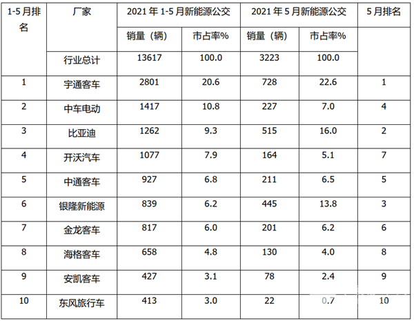 从上表看出,2021年5月及1-5月,在新能源公交客车主流企业销量TOP10中特点分别如下: