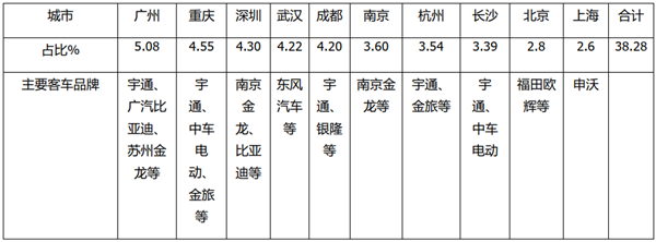 上表显示,2021年前5月新能源公交客车流向的前10个城市中: