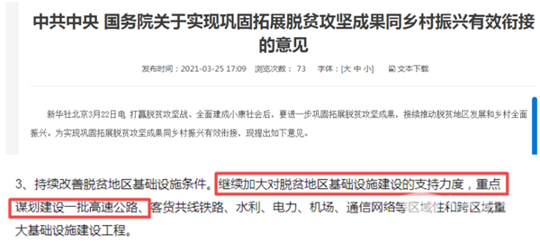 紧接着在2021年3月25日,中共中央、国务院印发《关于实现巩固拓展脱贫攻坚成果同乡村振兴有效衔接的意见》(下简称《意见》) 。《意见》强调要大力建设我国农村公路,并谋划建设一批高速公路,构建城乡交通一体化,推动乡村经济的全面振兴。