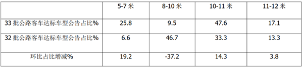 三、从交通部今年发布的前不久发布的32-33批客车达标车型公告分析,也可看出目前5-7米小客车市场增速最快,一定程度上可证明今年前5月城乡客车市场的高速增长