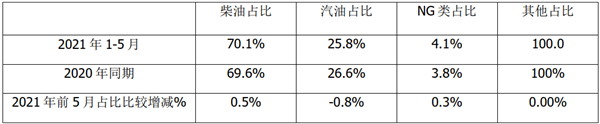 终端上牌数据显示,2021年1-5月当然城乡客运市场中,销量占比最大的是柴油动力车型,其次为汽油,柴油占比7成,且占比同比增加最多